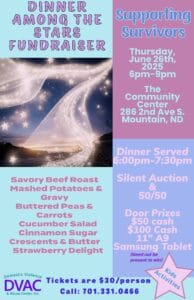 DVAC Dinner Among the Stars Fundraiser + Add to Google Calendar+ iCal / Outlook export DateJun 26 2025Expired! Time 6:00 pm - 9:00 pm Cost$30.00 LocationMountain NDThe Community Center Organizer Domestic Violence & Abuse Center Phone (701)331.0466Share this event